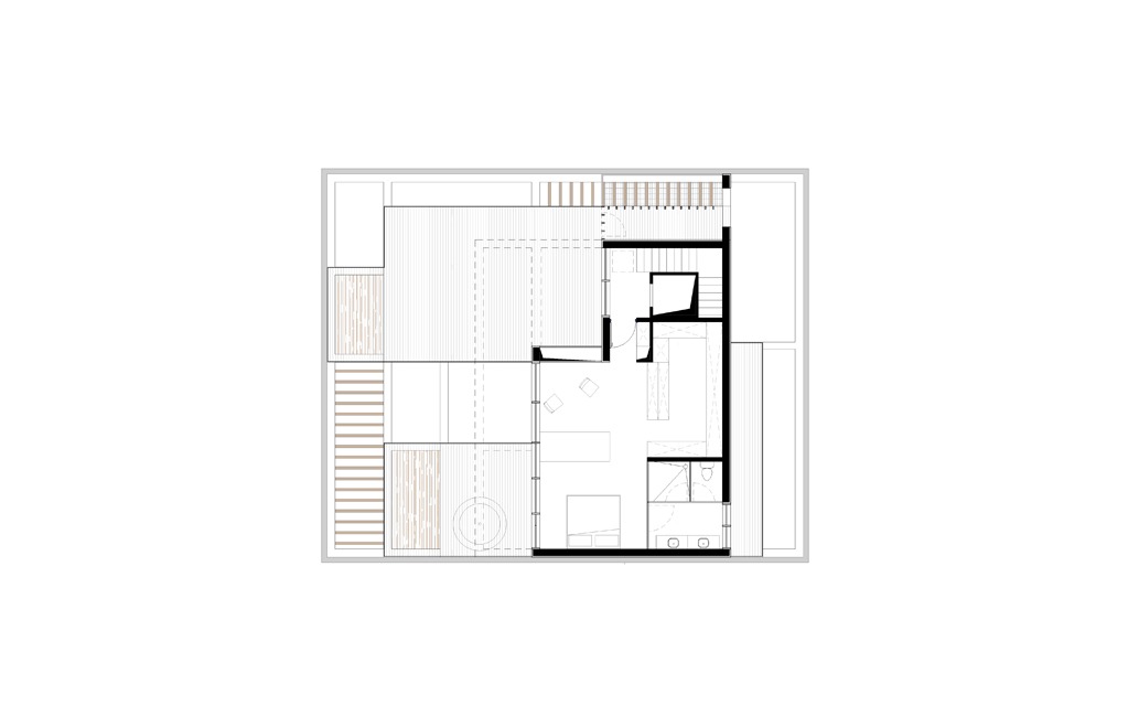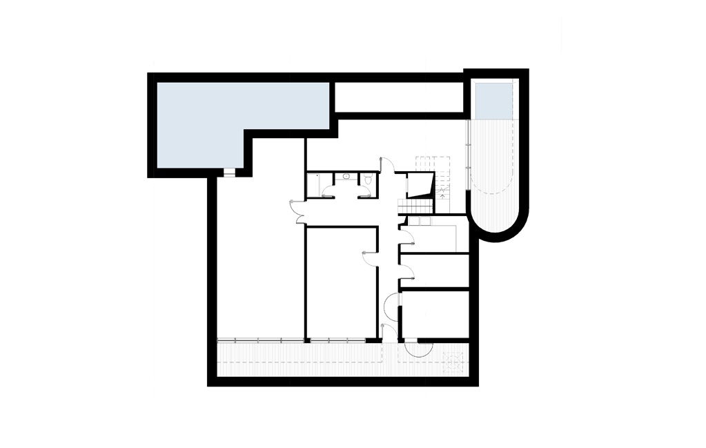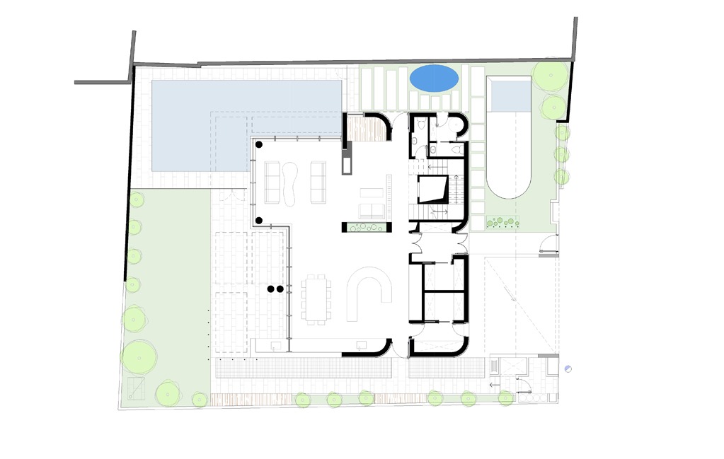 מעטפת קומת הקרקע טבולה בבריכה ומגדירה על ידי קיפולים פנימיים את החללים המשותפים.
