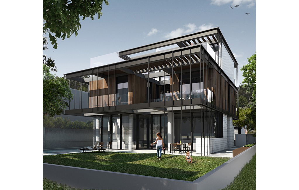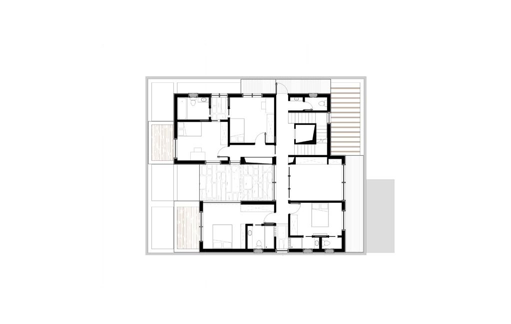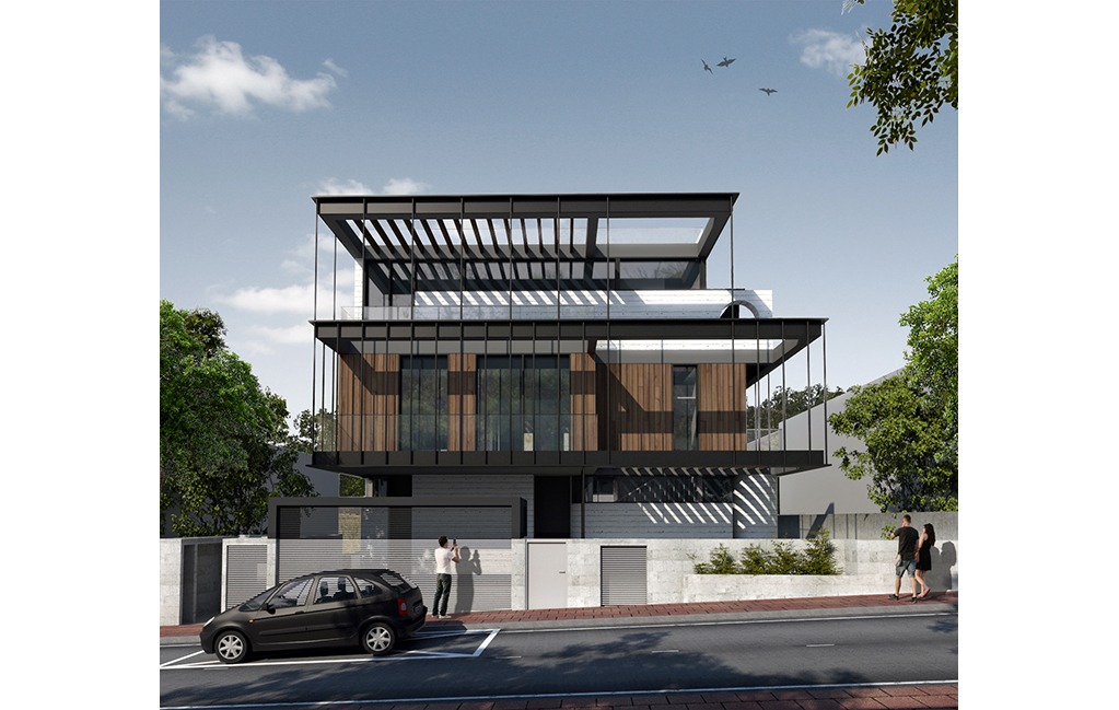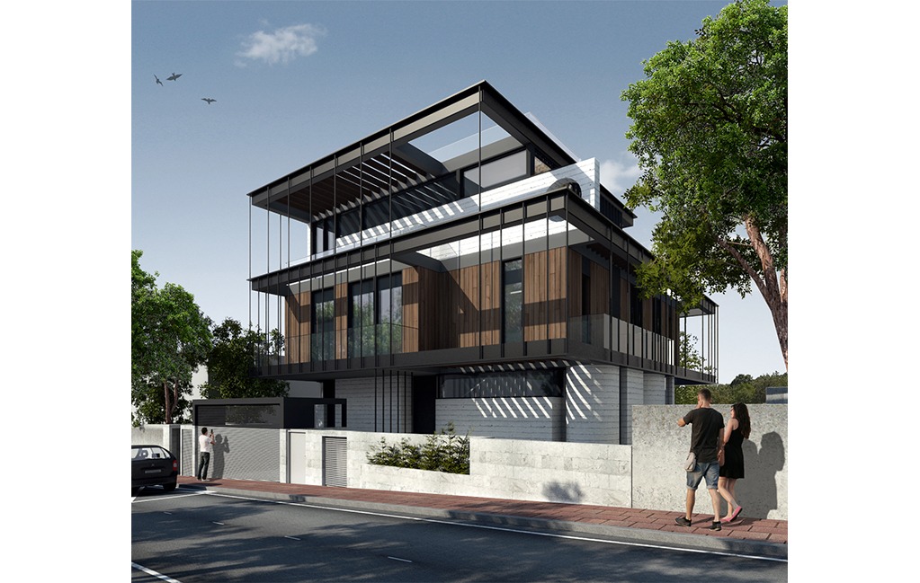 קומות המגורים מתוכננות סביב פאטיו פנימי ויוצאות אל מבנה שלד ומרפסות בחזית האחורית.